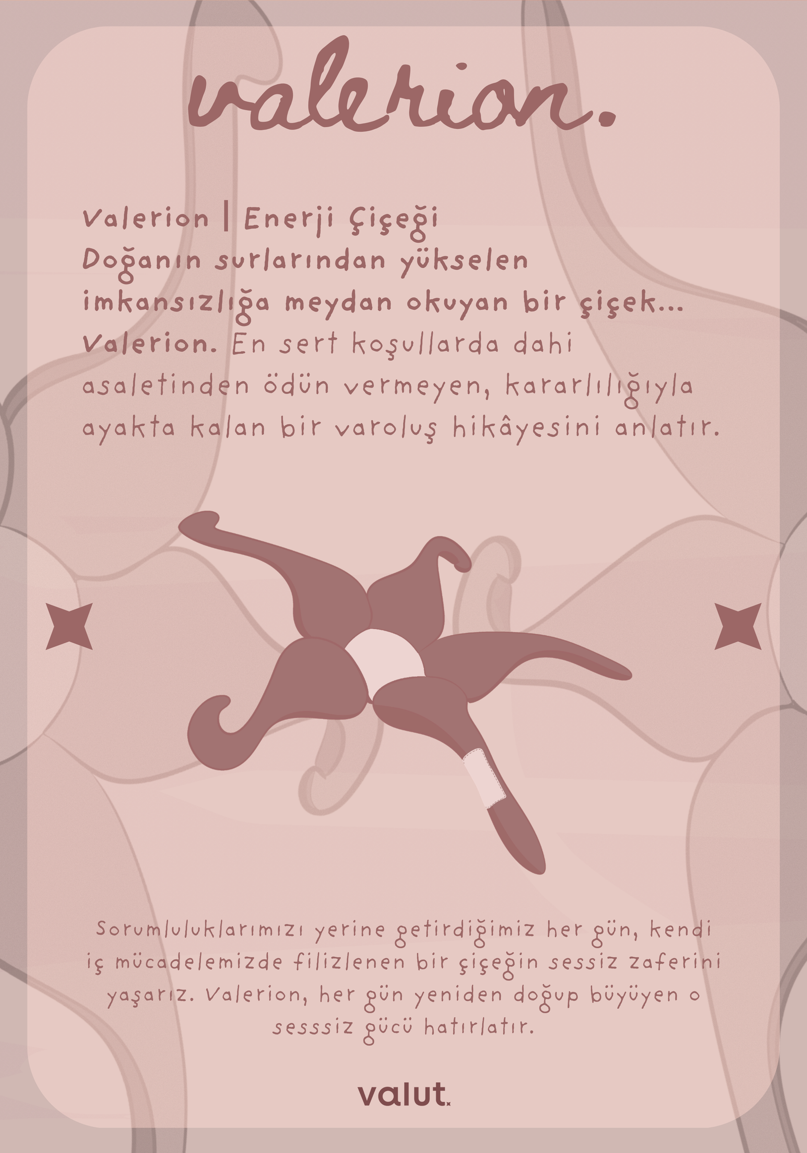 Doğanın surlarından yükselen imkansızlığa meydan okuyan bir çiçek… Valerion. En sert koşullarda dahi asaletinden ödün vermeyen, kararlılığıyla ayakta kalan bir varoluş hikâyesini anlatır. Sorumluluklarımızı yerine getirdiğimiz her gün, kendi iç mücadelemizde filizlenen bir çiçeğin sessiz zaferini yaşarız. Valerion, her gün yeniden doğup büyüyen o sesssiz gücü hatırlatır.